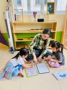 Các bé sẽ học bằng tiếng Việt vào buổi sáng và học bằng tiếng Anh vào buổi chiều. Các bé học với giáo viên Montessori là cô giáo Việt Nam. Cô có thể dạy bằng tiếng việt và tiếng Anh theo chương trình và phương pháp Montessori. Bên cạnh đó, riêng lĩnh vực ngôn ngữ, bé học thêm với giáo viên nước ngoài 3 buổi/tuần, cũng theo chương trình và phương pháp Montessori .